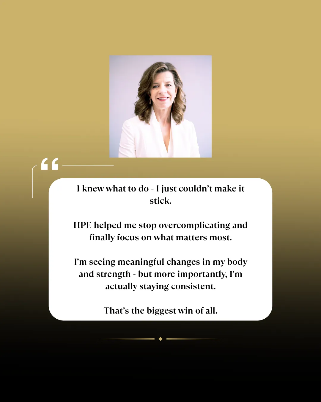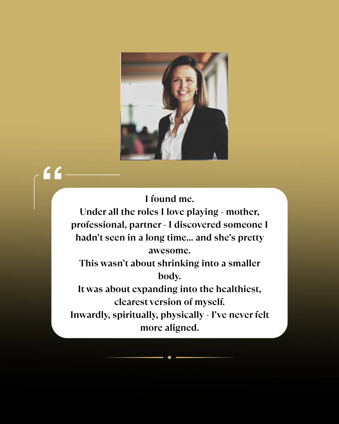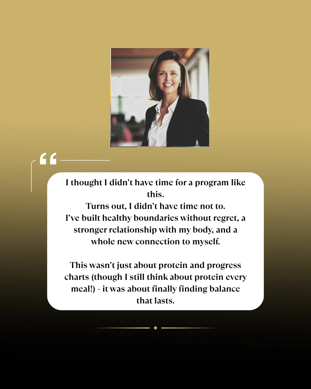 ✅ You’re a high-achieving woman (35-60) who’s done with quick fixes and ready for a smarter, sustainable path to strength, energy, and ease - no extremes, no all-or-nothing.